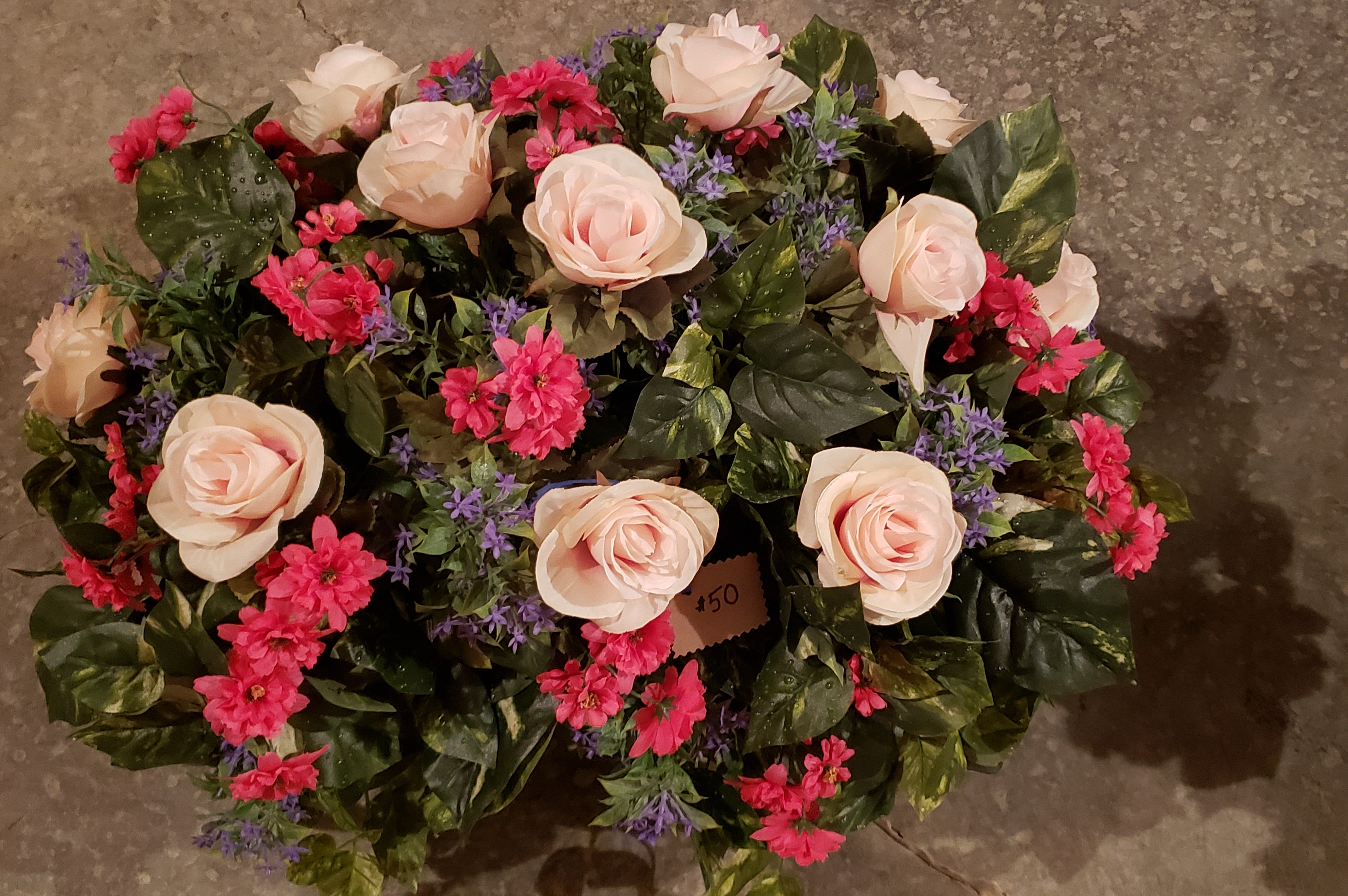 We use high-quality silk flowers to create a custom saddle just for you. Our saddles start at $60 and are substantial in size (21 inches wide and 14 inches deep).